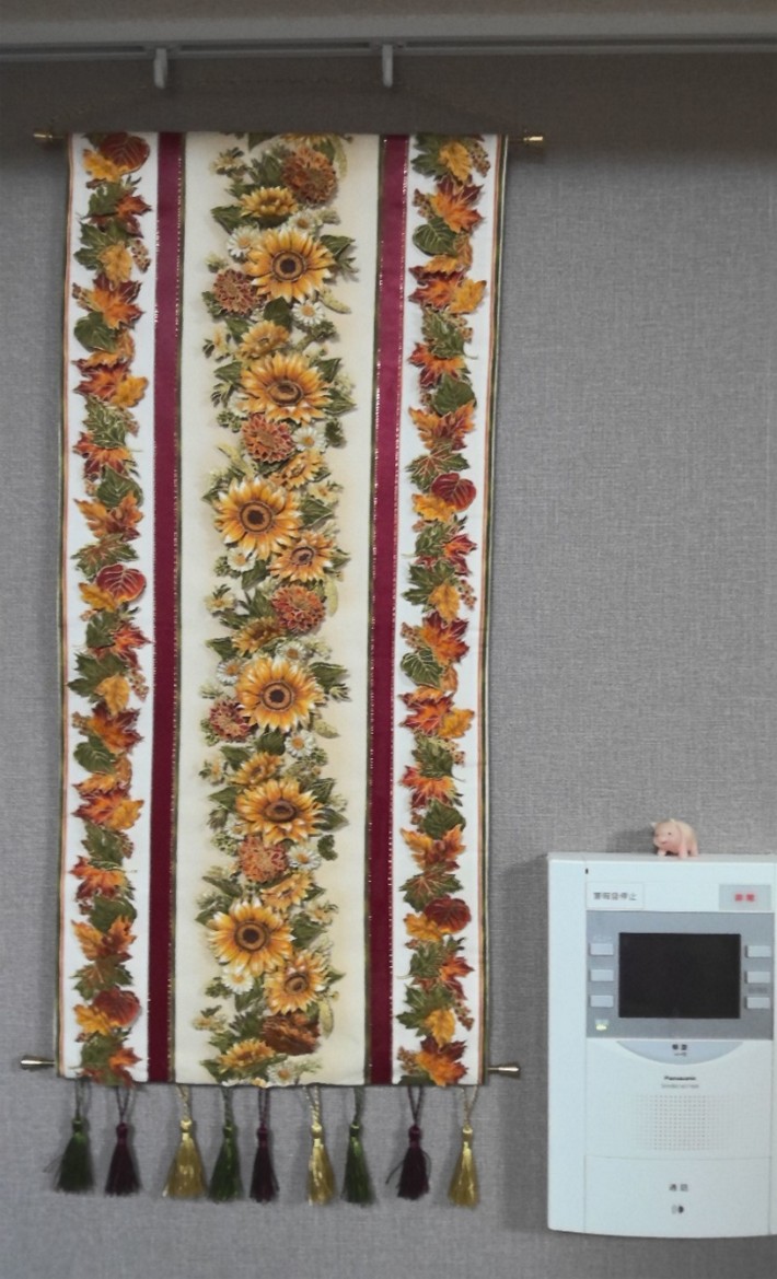 ↓こちらのタペストリーはお稽古で作りました。東京都美術館で展示して いただいた作品で、タイトルは『ソレイユ~みんな輝いて』です。
